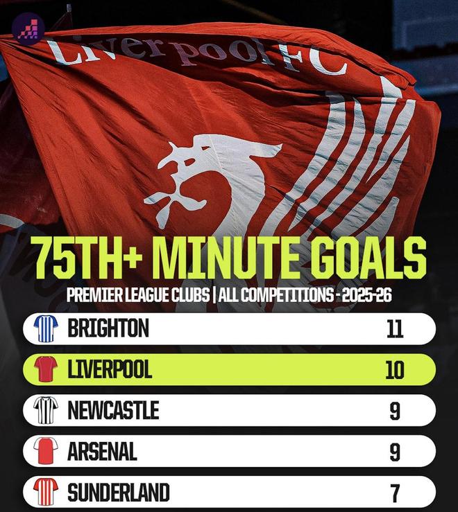 本赛季英超球队第75分钟后进球榜:布莱顿居首,利物浦第二
